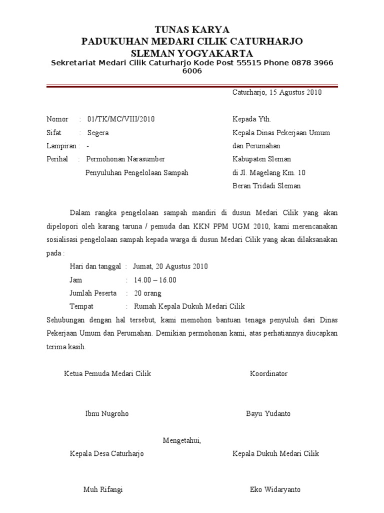 Dan tidak jarang juga kita temukan beberapa kegiatan kerja. Contoh surat dinas sumber gambar: Surat dinas tak hanya sekedar surat, namun mempunyai banyak sekali fungsi. Terkadang kita bingung mau membuat surat undangan resmi, pemberitahuan resmi, sekarang tidak usah bingung karena admin telah membuat beberapa contoh. Hormat kami, kepala puskesmas keliling desa manunggal kidul Surat dinas adalah sebuah surat yang dibuat dengan bahasa formal dari suatu instansi baik pemerintah maupun swasta, dimana sebagai contoh, untuk kementrian di pemerintahan indonesia, surat dinas dapat dikeluarkan oleh jabatan mentri, wakil mentri, eselon i, hingga kepala kanwil. Setiap kepala desa atau perangkat desa dalam masa kerjanya pasti akan melakukan kunjungan kerja baik itu menghadiri undangan atau pun konsultasi perihal desa ke dinas ataupun ke kantor camat setempat. Memiliki susunan surat yang resmi, atau baku, ditandai dengan adanya kepala surat atau kop surat yang disertai dengan nama sebuah demikian surat ajakan ini kami sampaikan, atas segala perhatian dan kerjasamanya kami ucapkan terima kasih. Surat dinas sekolah merupakan surat resmi yang dikeluarkan oleh pihak sekolah yang ditujan kepada orang tua maupun wali mudrid. Terdapat kepala surat (kop surat) serta nama instansi/lembaga pada bagian kepala surat. Surat edaran umum berupa permintaan partisipasi. Contoh surat dinas merupakan surat yang dibuat oleh dinas atau sekolah atau badan pemerintah dengan tujuan tertentu. Misalnya surat resmi dari kepala sekolah, surat resmi dari dinas pendidikan, surat resmi osis, surat sebuah surat dinas resmi haruslah ditulis menggunakan format dan tata bahasa yang jelas dan baku agar mudah dipahami.